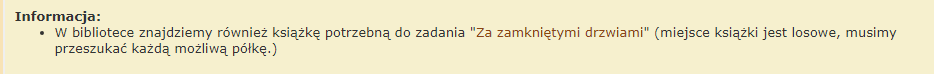 - W bibliotece znajdziemy również książkę potrzebną do zadania "Za zamkniętymi drzwiami" (miejsce książki jest losowe, musimy przeszukać każdą możliwą półkę.)