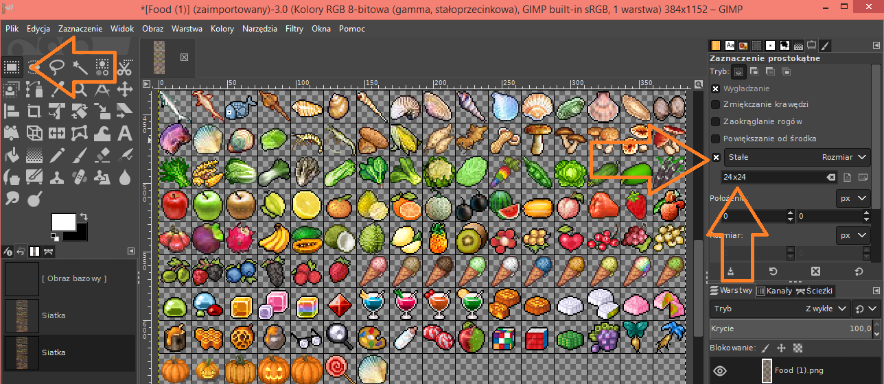 Wybieramy narzędzie " Zaznaczanie prostokątne" (strzałka w lewo) następnie ustawiamy parametry tego narzędzia czyli wybieramy "Stałe" i wpisujemy W poniższe pole "24x24" i enter