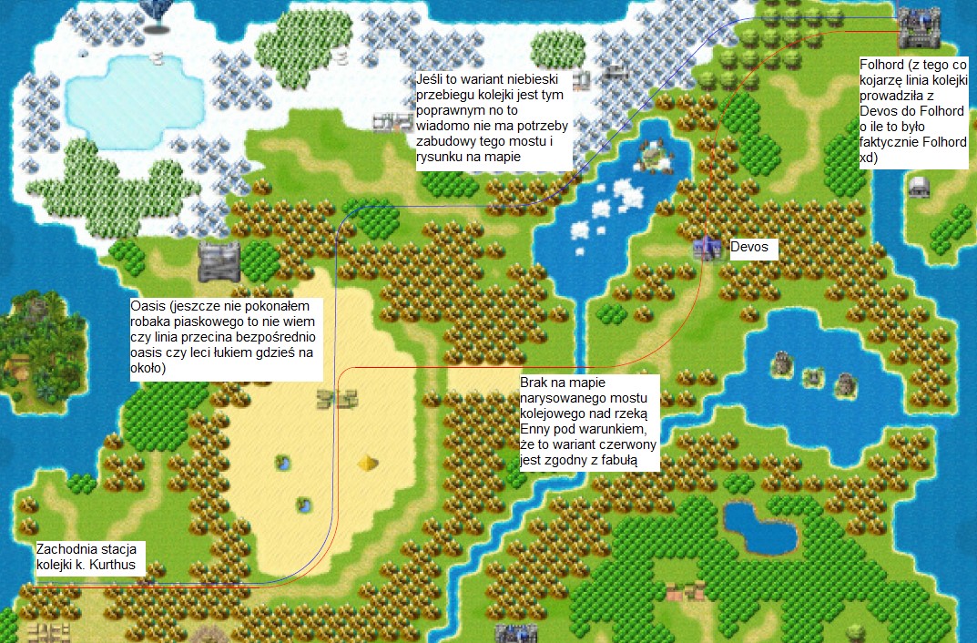 Problem jednak pojawia się na szlaku Oasis-Devos, bo jak wiemy z wypowiedzi różnych NPC w Kurthus i wcześniej jeszcze w Devos, kolejka ta jest relacji Kurthus Zachodni-Oasis-Devos-Folhord i tu pojawia się clue całej sprawy w jaki sposób jest ta linia poprowadzona czy na około jeziora Enny w okolicy Tajemniczej Wyspy czy może przez rzekę Enny która wpływa do jeziora jeśli to drugie to chciałbym zauważyć, że nad rzeką Enny na mapie nie widać żadnego mostu kolejowego i nie wiem w jaki sposób kolejka ta ma pokonać ten odcinek, nie wiem ma lewitować?? Jeśli jednak przebiega ona w okolicach Azarad to nie ma żadnego problemu. Do tego tematu przesyłam również infografikę z hipotetycznymi przebiegami linii kolejki oraz zwracam się z prośbą do kogoś kompetentnego od projektowania fabuły o stanowisko czy kolejka ma swój przebieg oznaczony mniej więcej jak na rysunku linią czerwoną czy może niebieską?