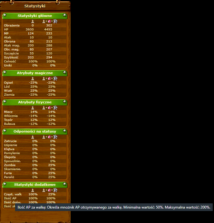 Hmm, ale w dalszym ciągu jest napisane, cytuję: "...Maksymalna wartość: 200%". Jak dla mnie 125%≠200% (na karcie statystyk mam wartość 100%). Nie powinno być raczej: "Maksymalna wartość: 100%"? Chyba, że postać ma bazowe 100%, i do tego +100 z eq, ale dlaczego w dalszym ciągu pokazuje tylko 100 (bazowe/bazowe+bonusy)?