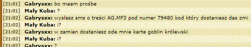 Gracz Gabrysxx tym razem przeholował u mnie, wcześniej zaoferował 30k za kartę dzbana a teraz już przeszedł siebie. Najpierw spytał czy mam telefon potem czy mam na nim dużo pieniędzy (30 zł) a następnie: