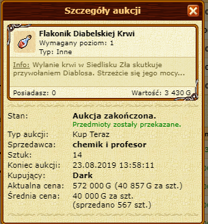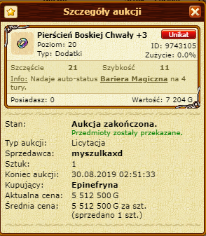 Powinna mieć około 5kk z samej tej aukcji, tymczasem obecnie na jej koncie jest 130G... Oczywiście tobie od wczoraj przybyło 4,44kk. (czyli tyle ile wychodzi po podwójnej prowizji 5,5kk.)
