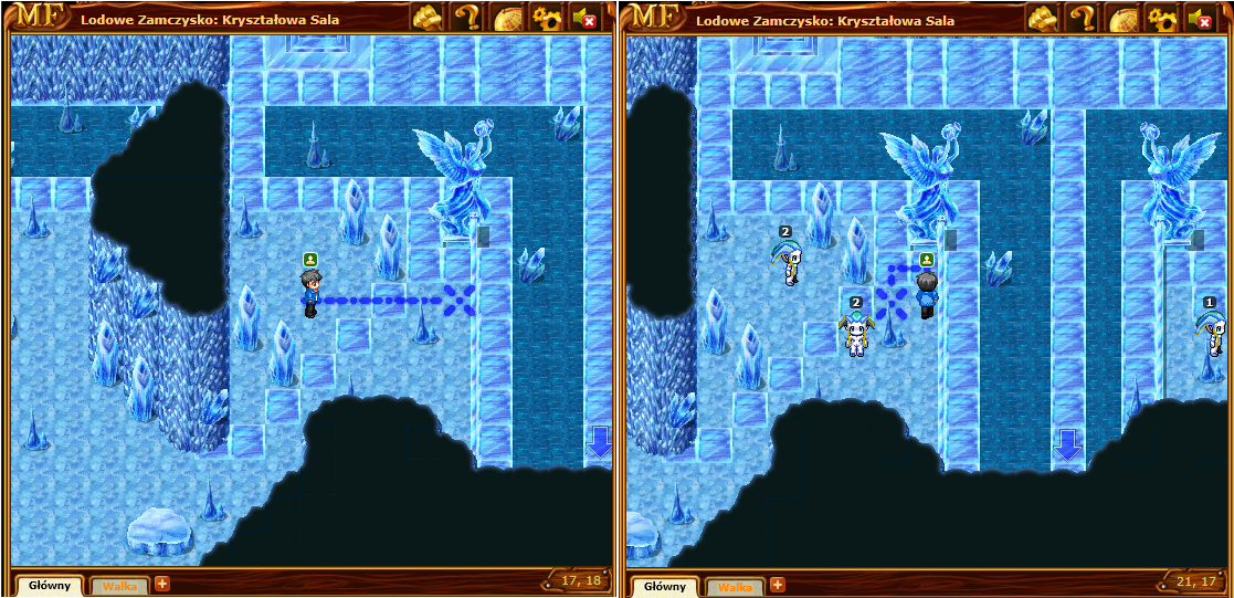 Gdy stoimy na polu 19,8 na Arkadii (przed Nordią) i po naciśnięciu strzałek tak jakbyśmy chcieli iść na skos pojawia się komunikat: "Ruch przez śnieg zużył 1 energii", chociaż postać się nie rusza.