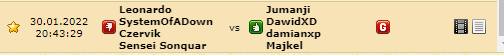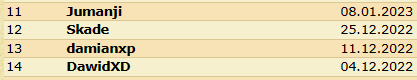 Ty tylko umiesz wyzywać, napisałem jak było, nawet nie masz jak się przyznać że to ty zacząłeś jak na PW Dawidowi i kaidanowi przyznaj się że ego zostało urażone jak przegrywaliście z takimi randomami jak my, to co piszesz to jest nie dość że śmieszne to żałosne.