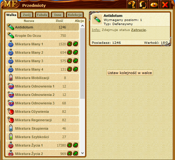 Czy da się zmienić kolejność przedmiotów w zakładce przedmioty? Nie chodzi mi o kolejność w walce, tylko o kolejność przeglądania zakładki. Trochę mam pomieszane, a chciałbym poukładać w kolejności hp/odno/mp itd.