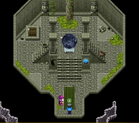 Portal w podglądzie mapy Wyklęta Świątynia: Komnata Zstąpienia jest widoczny jako aktywowany Błękitnym Pyłem. Wszędzie indziej widać sam podest bez aktywowanego portalu.