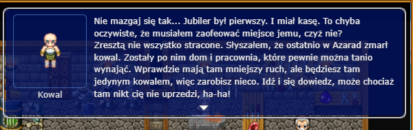 ponadto, po pokonaniu rzezimieszka otrzymujemy komunikat "Złodziejaszek pokonany. Mogę wracać do Nordii po nagrodę.", choć zadanie zostało przyjęte w Devos