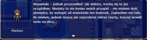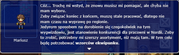 Dialog po skończeniu zadania "Od czeladnika do kowalskiego mistrza" i wejścia do lokacji Dom Handlowy: Pracownia.