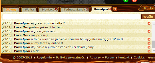 Gracz ostra: wyłudzanie 200 k golda oraz zmuszanie do zaatakowania i poddania sie Zamian za ***. Nie polecam jej później po odmowie dania 200 k i 6 wygranych bójek grozi atakami I sabotami dopóki nie dam jej 200 k https://mfo3.pl/r/b3a975691 wiadomości od ostra: Foch ******* sie masz ignor do odwołania prucz walk i handlu. Ona to złodziejka;-;