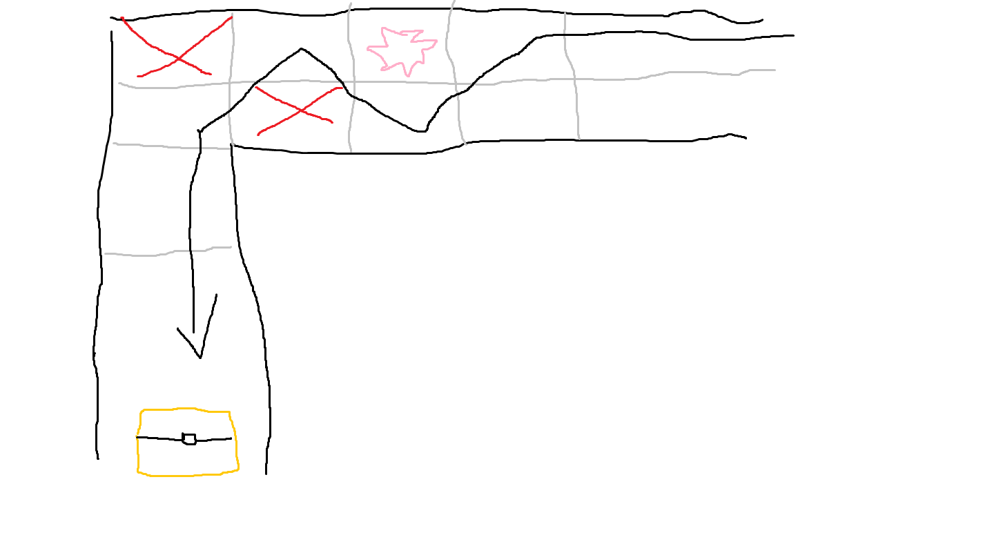 To jest ta droga po skrzynkę. Szedłem górną, widoczną częścią. Na swojej drodzę widzę pułapkę - dziurę (oznaczoną różowym), oraz widoczne mi kolce w rogu. Oczywistym dla mnie było to, żeby iść dołem jedno pole, jednak no raczej 99% osób poszłaby od razu na kolejne pole na lewo, skoro są tu już dwie widoczne pułapki. No pole na lewo od tego wolnego pola było kolcami, których nie było widać, bo były ukryte. Droga, którą zaznaczyłem, była jedyną drogą przejścia tego rogu i bądźmy szczerzy - kto by normalnie tak poszedł? Poza tym zawsze starałem się chodzić widoczną trasą i tutaj zrobiłem "umyślny" skrót, który skończył się całkowitym resetem, a byłem już po wciśnięciu dolnego przycisku.