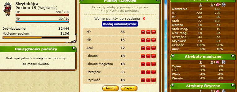Nie wiem jak chcesz grać w sumie. Jeżeli chcesz mieć tylko atak, no i luck taki, żeby trafiać ciągle, to speeda bym dał 60 czy ile tam do limitu (zeby sie atak nie zawieszal) Tymi 60 punktami ulepszyłbym szczęście o 20 punktów, atak o 40 (o ile by się nie zawiesiło). Jeżeli chcesz mieć speed jako taki, to tak jak mówisz: 20 ze speeda i w lucka, reszta zostaje.