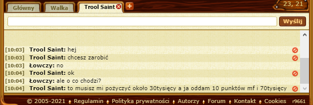 Gracz Darretien handluje EQ za pieniądze. Po tym jak zwróciłam mu uwagę, że jest to zabronione przez regulamin gry, zaczął mnie wyzywać, pisać "skończ pierdolić", "mam brata testera", "nic nikomu nie sprzedałem" oraz zarzucać mi, że sama łamię regulamin gry (czym? nie wiadomo).