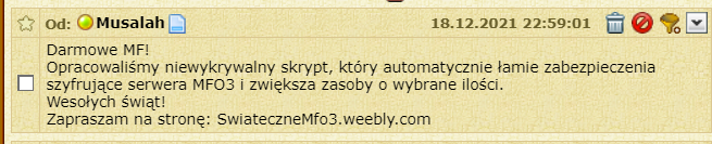 Ja to otrzymałem i mój kolega od gracza (ZuziaNinja) mój kolega jest młodszym graczem i wszedł na tą stronę po wejściu musiał wpisać swój login i hasło z mfo jako że nie chciał narażać swojego konta napisał moj nick i hasło (bez mojej zgody/wiedzy) i gdy weszłem do gry zniknęło mi 500k 300żetonów 13 MF i większość przedmiotów np. Srebrny pył karta zielonej poczwary( te 13 MF udało się odzyskać bo oni sprzedawali wszystko za 1g ale MF można tylko licytować więc zdążyłem). Nie oczekuję oddania mi zasobów chcę tylko żeby Ci oszuści zostali zlikwidowani że względu na młodszych graczy
