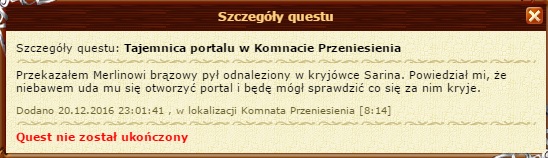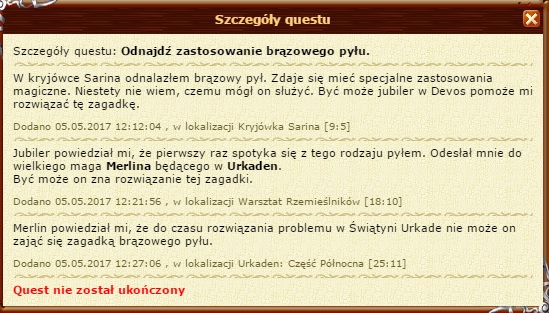Pytanko co do questu "Odnajdź zastosowanie Brązowego Pyłu" Poszedłem do Merlina na dach pokazać mu Brązowy pył.