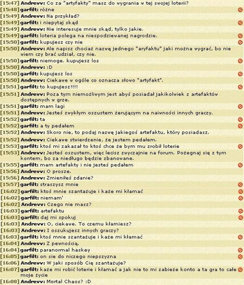 Gracz pisał, że na loterii są do wygrania artefakty. Skrinów z czatu, gdzie reklamował akcję, nie zdążyłem zrobić.