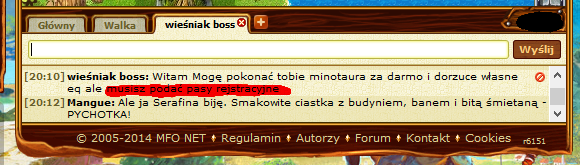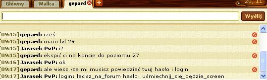 Witam,dzisiaj expiłem i jeden gracz o nicku tygrs (tak dobrze napisałem,tygrs) napisał mi na chacie że ktoś go okradł i czy mogę mu dać ekwipunek żeby pokrył straty bo nie ma nic.potem napisał mi że osoba która go okradła (według niego w prawdziwym życiu wyszarpała mu z rąk kartkę na której były napisane jego login i hasło) jest gracz na 50 poziomie manaT.co jeszcze dziwniejsze najpierw mi napisał że nie pamięta nicku.Potem po wypytywaniu napisał nick manaT'a (ten gracz istnieje).A gdy się go spytałem że skoro zabrał mu w prawdziwym życiu kartke z loginem i hasłem do konta (co samo się wydaje dziwne) i że był to jakiś 50 lvl (napisał że był to jakiś 50 lvl ale nie pamięta nicku) to on napisał że nick tego niegodziwca to jego imie... Dopiero potem podał mi nick manaT'a.